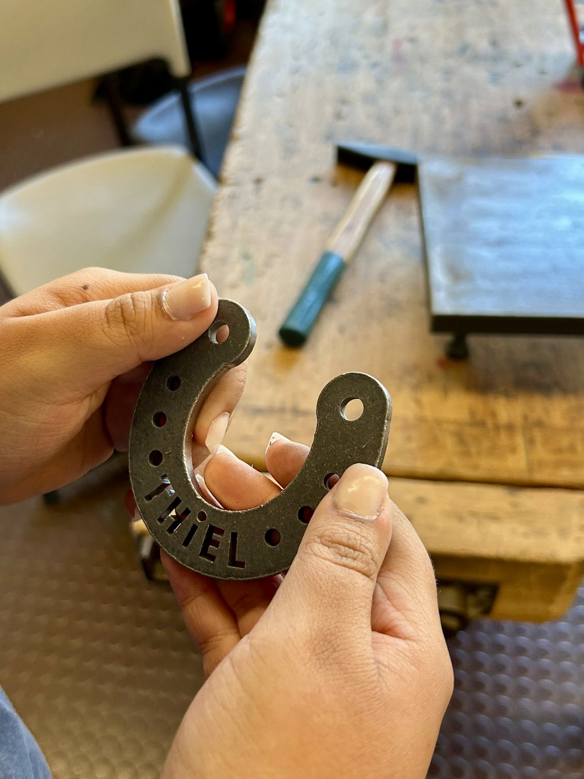 Wir haben einen kleinen Lederbeutel gefertigt nach unserer Wunschfarbe. Auf einem Stück Leder markierten wir mit einer Mustervorlage den Umriss des Beutels und die Löcher für die Schnur. Danach haben wir das überstehende Leder abgeschnitten und mit einer Lochzange die Löcher gestanzt. Als nächstes zogen wir die Schnur durch die Löcher und konnten so den Beutel oben zusammenziehen. Damit der Beutel nicht von allein aufgeht, haben wir eine Perle auf die Schnur gezogen.
